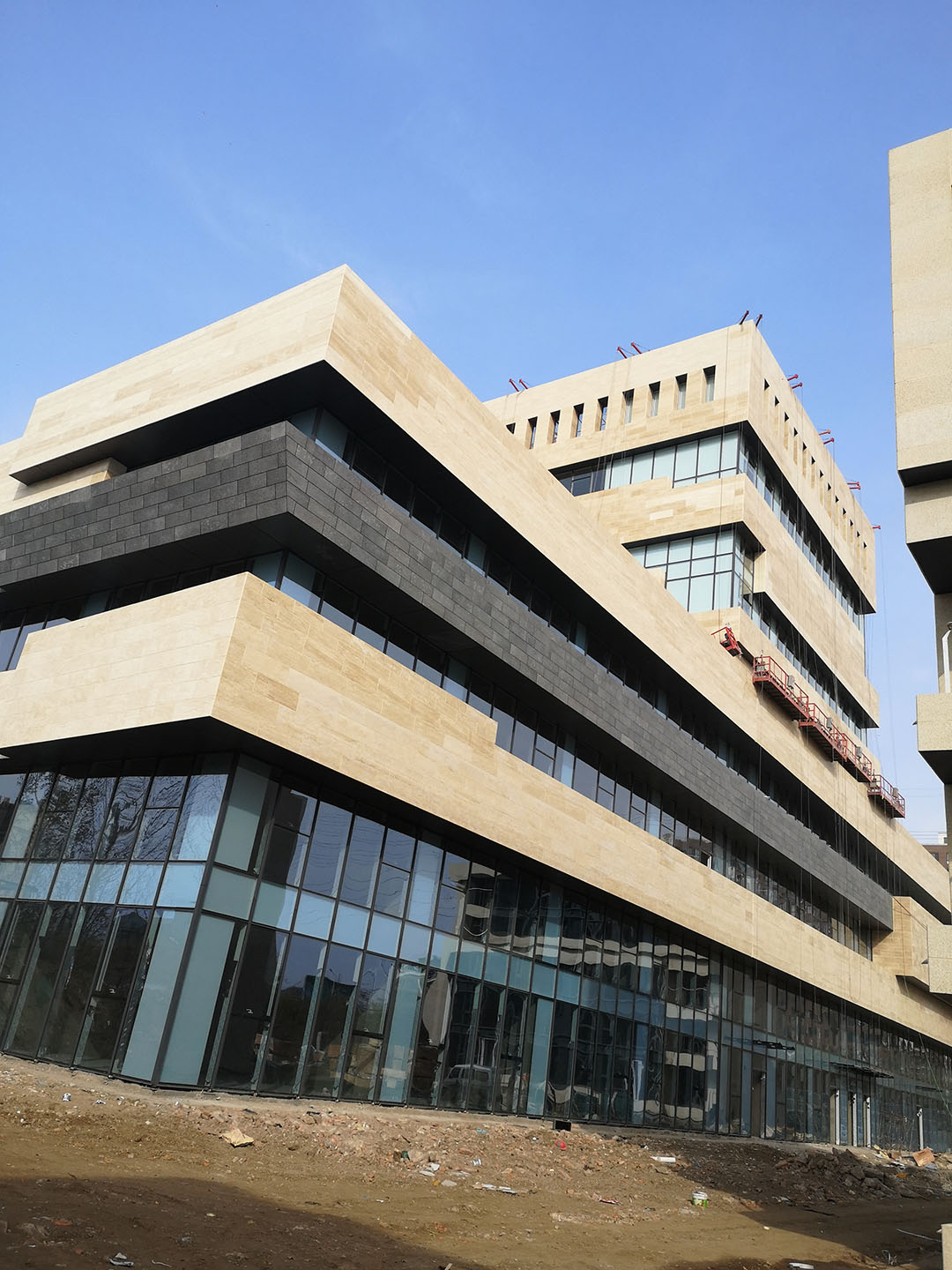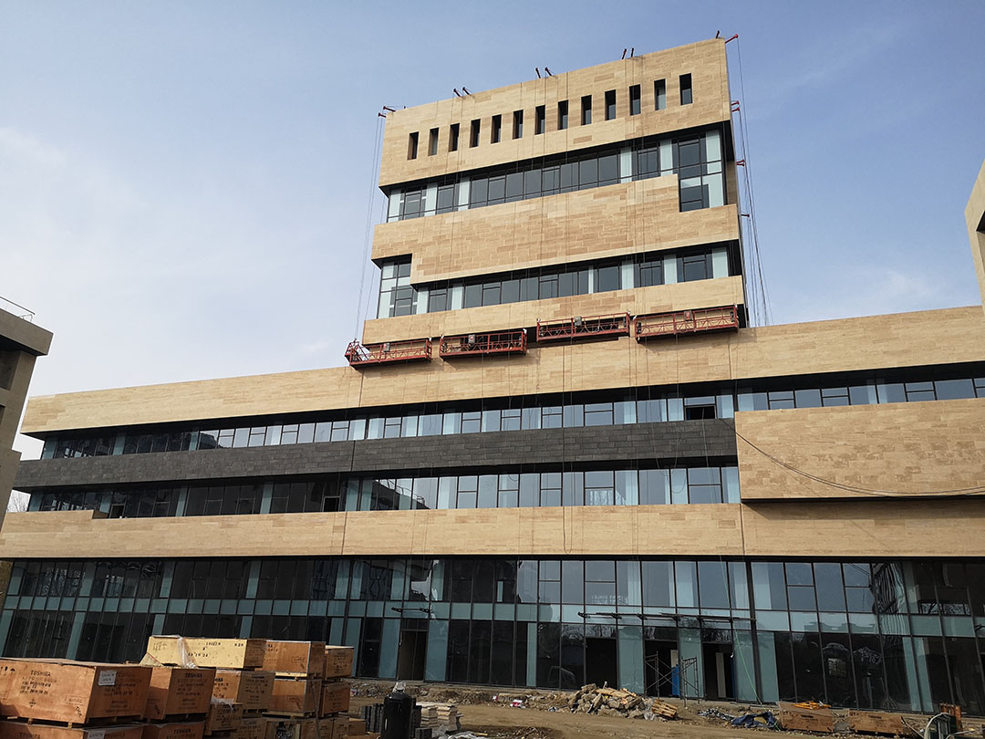 施工內容:石材幕墻、玻璃幕墻、鋁單板吊頂、玻璃欄板、點式玻璃雨棚、斷橋鋁合金平開窗、鋁合金百葉等